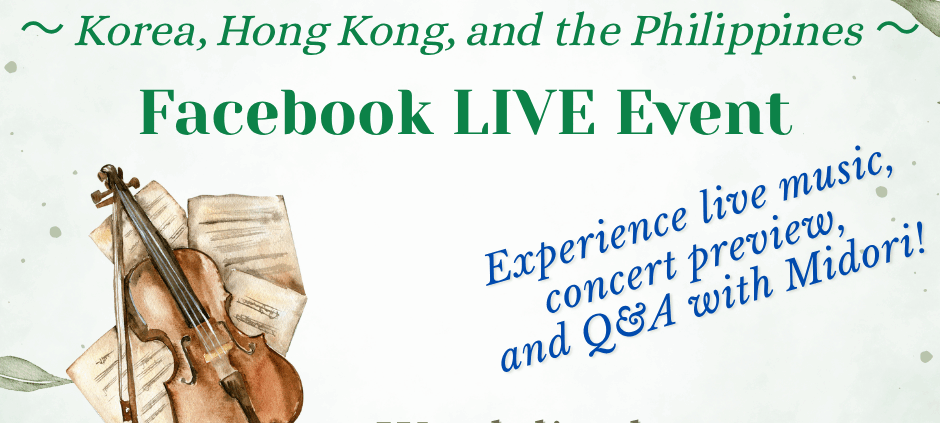 【お知らせ】 Facebook Live Event 10月16日(木)日本時間 午後8時 開催 October 15, 2025/in News, 日本語 /by Evelyn Velleman10月15日 来たるアジアツアー2025(韓国・香港・フィリピンー詳細はこちら)に先立ち、Facebookで初のライブ配信を実施します。是非ご参加ください。配信は英語で行われます。 ≪日時≫ 2025年10月16日(木)午後8時(日本時間) ≪Midori公式Facebook≫ https://www.facebook.com/GoToMidori/ ≪内容≫ ライブ演奏2曲 ツアー公演情報とプレビュー 質疑応答 ライブ配信中は、Facebookコメント欄から質問をお送りください! https://www.midori-violin.com/wp-content/uploads/1.png 788 940 Evelyn Velleman https://www.midori-violin.com/wp-content/uploads/midori.png Evelyn Velleman2025-10-15 06:34:532025-10-15 07:33:23【お知らせ】 Facebook Live Event 10月16日(木)日本時間 午後8時 開催